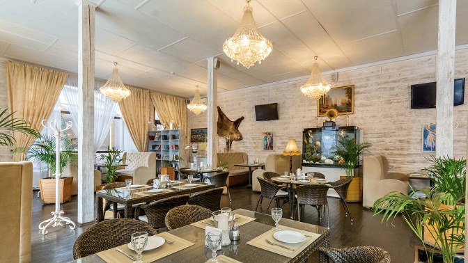 • Вас ждет зал с интересным интерьером и декором, который передает характер заведения и его атмосферу. В этой комфортной обстановке легко настроиться на спокойный отдых и на время забыть обо всех проблемах. Здесь вы сможете обсудить дела с коллегами, пообщаться с друзьями, провести время с семьей или устроить романтическое свидание. Вежливый персонал, быстрое обслуживание, большой выбор блюд и напитков — вы отлично проведете время.