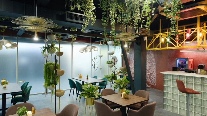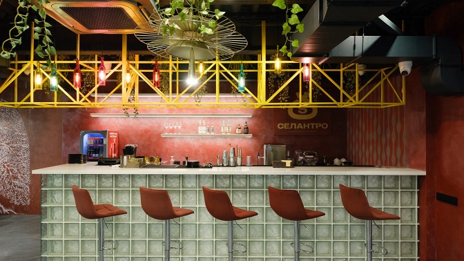 • Вас ждет зал с интересным интерьером и декором, который передает характер заведения и его атмосферу. В этой комфортной обстановке легко настроиться на спокойный отдых и на время забыть обо всех проблемах. Здесь вы сможете обсудить дела с коллегами, пообщаться с друзьями, провести время с семьей или устроить романтическое свидание. Вежливый персонал, быстрое обслуживание, большой выбор блюд и напитков — вы отлично проведете время.
